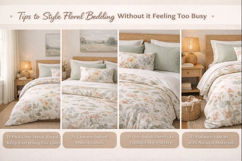 Choose one floral hero, repeat calm colors, rely on solids and texture, and let your room breathe. Done right, floral bedding doesn’t make your space look busy.