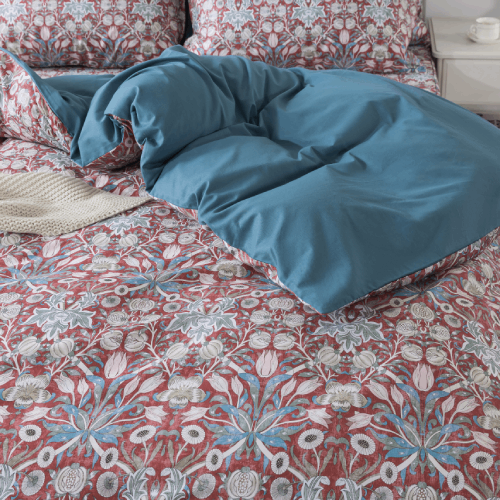 The front features a pattern of flowers in dark red teal, while the back is a solid color. Crafted from 100% pure cotton, this bedding ensures softness, breathability, and skin-friendly comfort.
