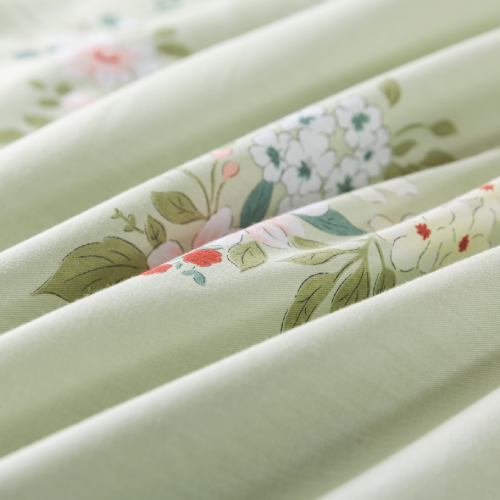 The overall color scheme is soft and refreshing, striking a perfect balance between subtlety and vibrancy, making it ideal for creating a calm and relaxing bedroom ambiance. The matching duvet cover and pillowcases maintain a harmonious design that ties the entire look together. Displayed with a simple grey headboard and soft bedroom decor, the set brings an elegant and warm touch to the space. This bedding set is perfect for those who appreciate vintage, garden-inspired styles, adding a fresh and sophisticated accent to any bedroom.